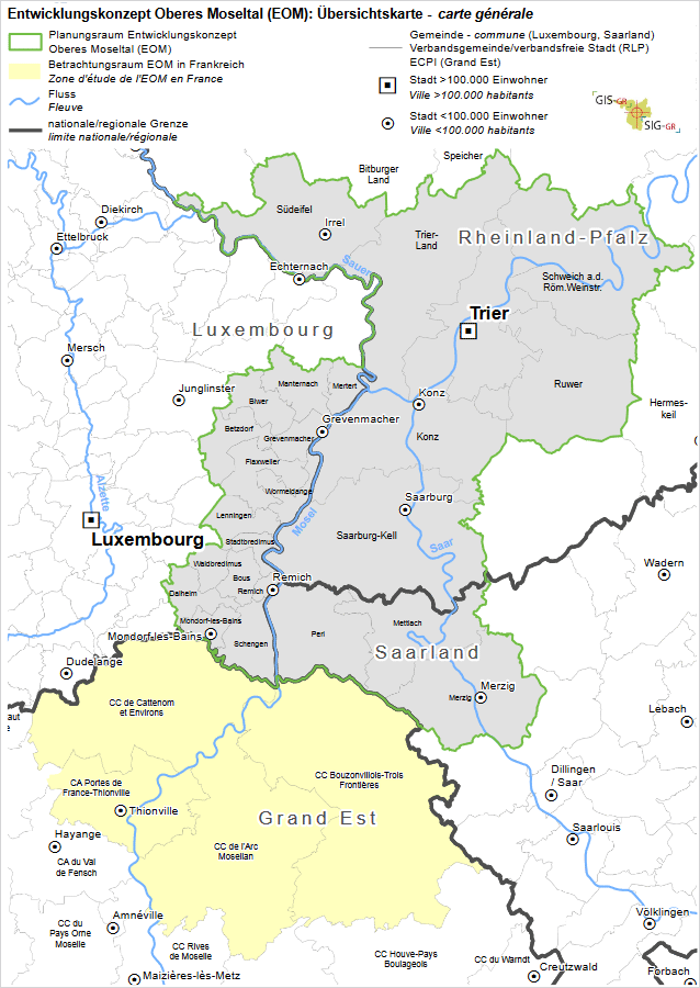 La zone de projet de l‘EOM s’étend le long de la Haute Vallée de la Moselle et des vallées voisines de la Sauer, de la Syre, de la Sarre et de la Ruwer, de Schengen / Perl jusqu’à Föhren et de Trèves ainsi que Merzig jusqu’à la limite de l’Eifel du Sud.